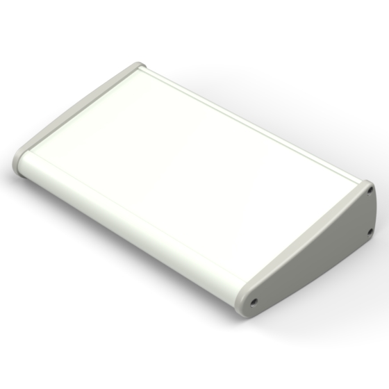 Contenitore in alluminio estruso inclinato con verniciatura esterna a polvere di elevato standard qualitativo. Due pannelli laterali in ABS, guide interne per PCB, parte superiore con area ribassata per l’alloggiamento di una tastiera a membrana. Chiusura a sei viti. Disponibili due combinazioni di colore: Nero RAL 9004/ Grigio scuro RAL 7012. Su richiesta, supporto per fissaggio a parete mod. “MT7.0”.