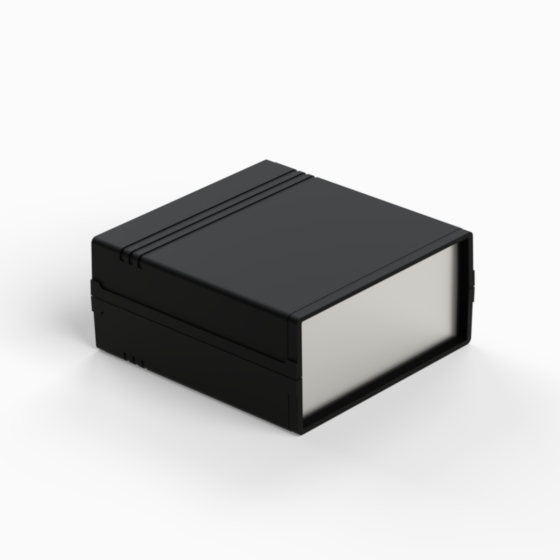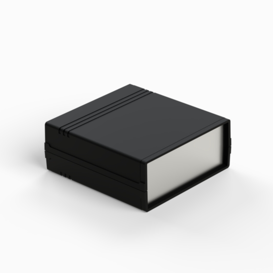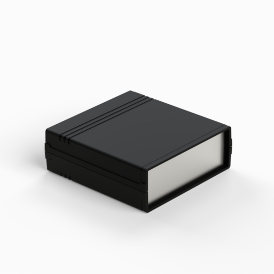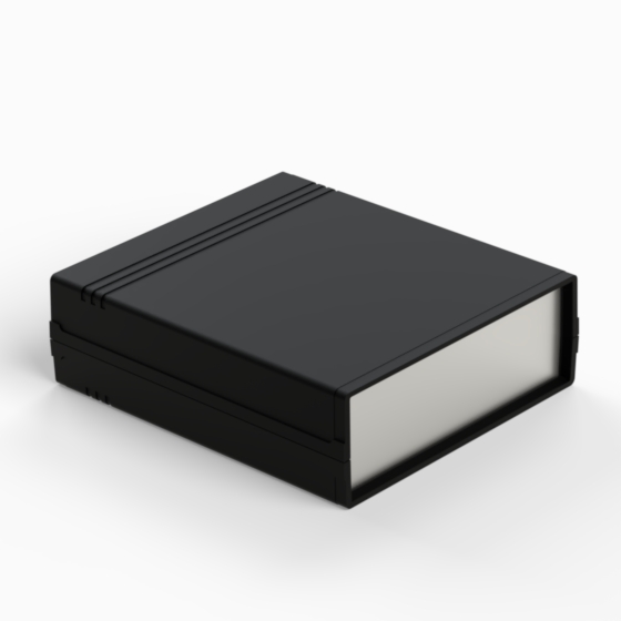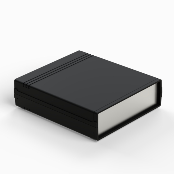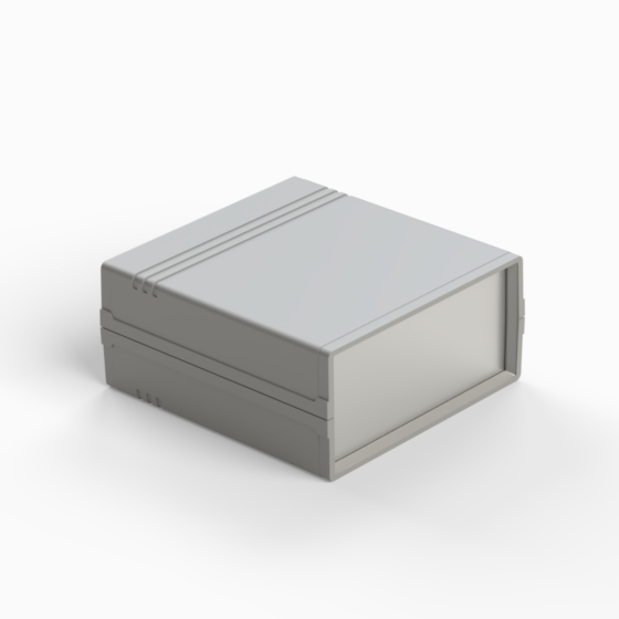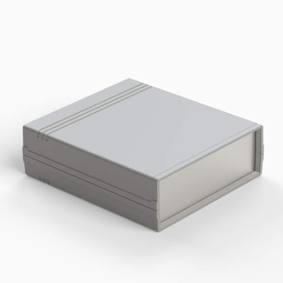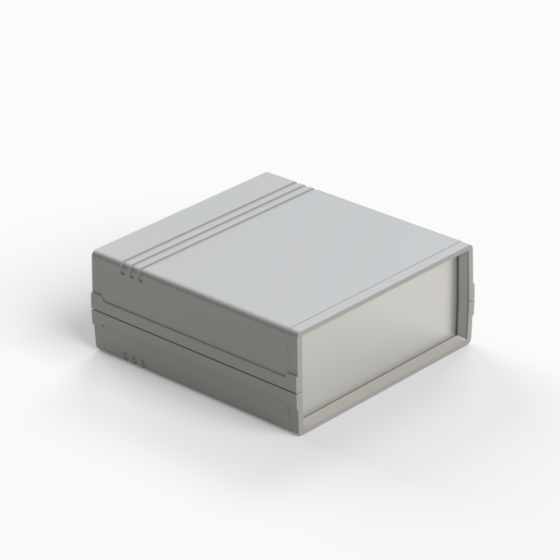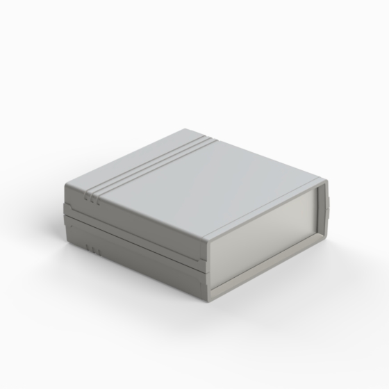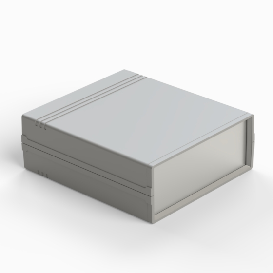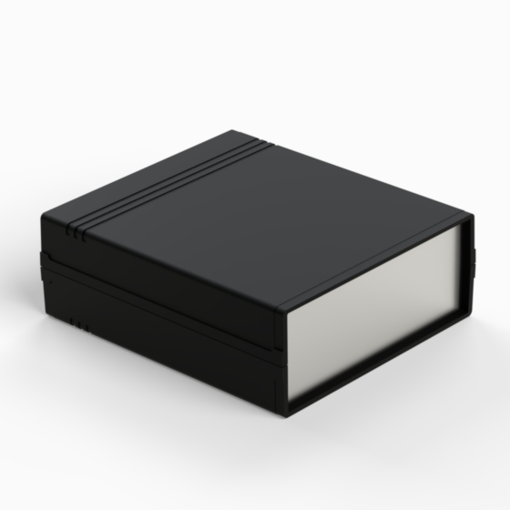 Contenitore in ABS con superfici opache. Pannello frontale in alluminio di spessore 1 mm e pannello posteriore in ABS dotato di alloggiamento per batteria 9V. All’interno sono presenti guide e punti di fissaggio per PCB. Chiusura con due viti. Il contenitore può essere dotato di pannelli in ABS di colore grigio chiaro (.13). Versione pannello in plastica: 011P-B, 012P-B, 022P-B, 222P-B, 223P-B, 233P-B.
