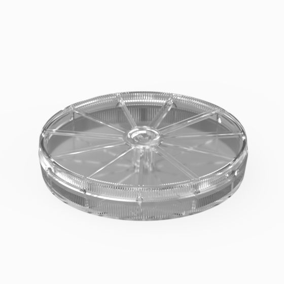 Contenitore circolare prodotto in metacrilato trasparente dotato di 10 scomparti, utile per contenere e selezionare piccoli componenti elettronici.