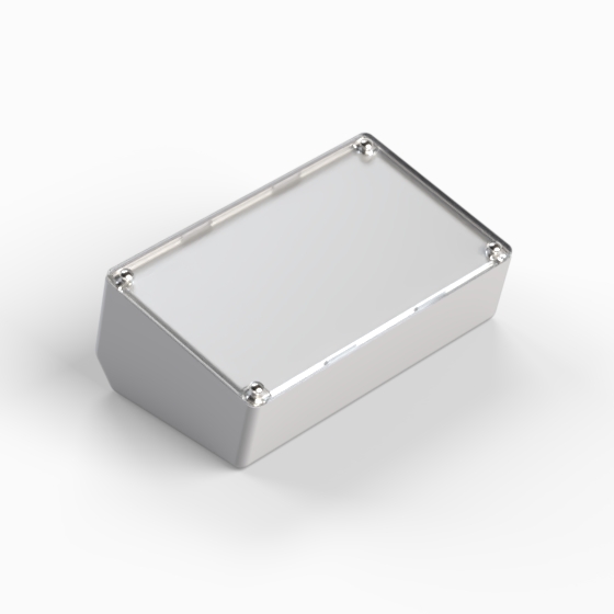 Contenitore in ABS dotato di pannello superiore in policarbonato trasparente inclinato di 15°, con pannello interno in alluminio anodizzato di spessore 1 mm. Pareti con superfici lucide all’interno delle quali sono presenti guide e punti di fissaggio per PCB. Chiusura a 4 viti.