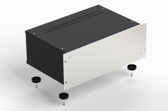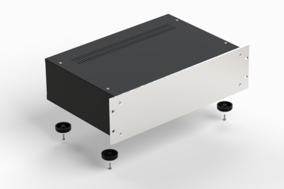 Serie di moderni contenitori da rack 19 pollici con finiture molto accurate. Pannello frontale in alluminio anodizzato di colore argento, coperchio e laterali in acciaio di colore nero. Fori superiori di aerazione. Pannelli rimovibili facilmente. ACCESSORI: Base interna zincata 175x435 mm. (Mod. LEVEL) – Maniglia piatta in alluminio anodizzato colore argento o di colore nero (Mod. FLAT RACK) – Maniglia tonda in acciaio plastificato di colore nero (Mod. ROUND RACK).