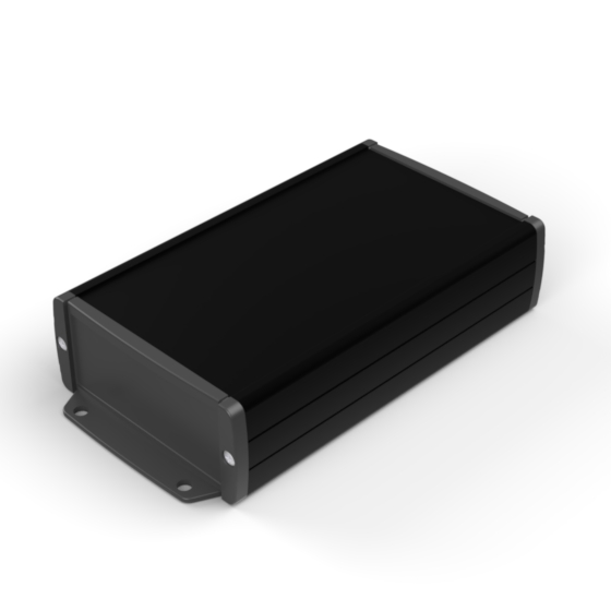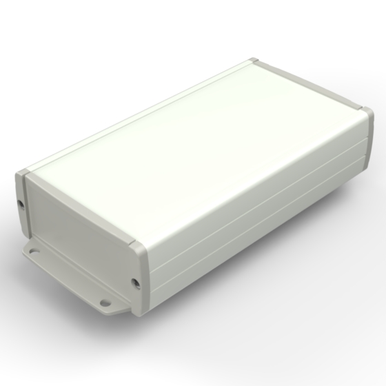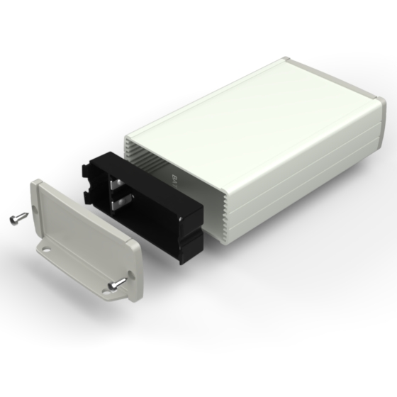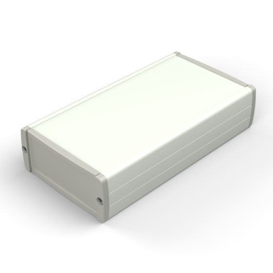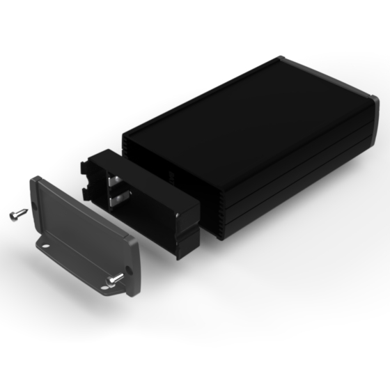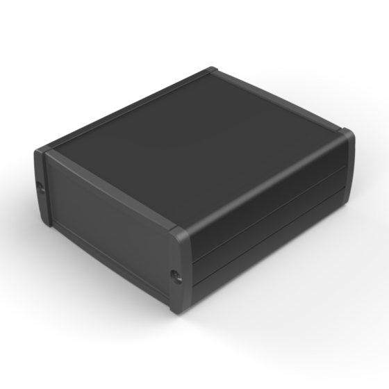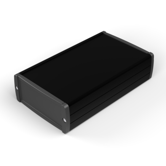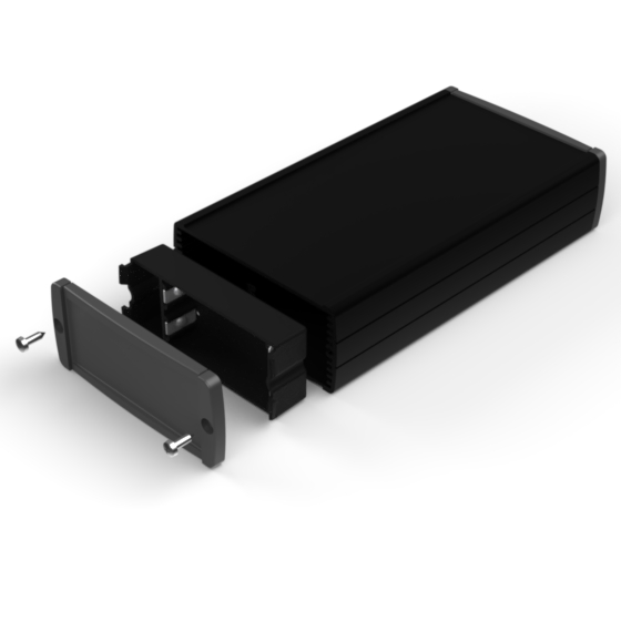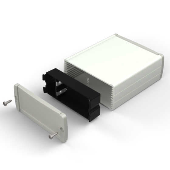 Extruded aluminium cases with high quality painted finishing. Two ABS front panels, internal slots for PCB’s and a recessed area for a keypad membrane. The model with “-B” has a battery compartment for two 1,5V mignon-cells (AA) or one 9V battery (PP3). Twelve standard models are available with different sizes. Closing by four screws.