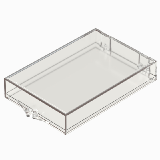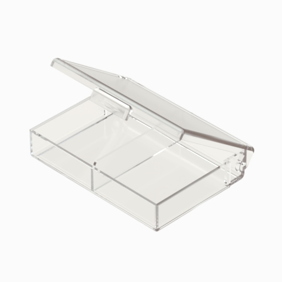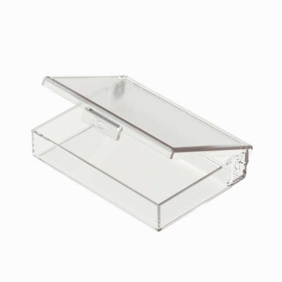 Series of small storage boxes with hinged transparent polystyrene lid. Glossy surfaces finish.