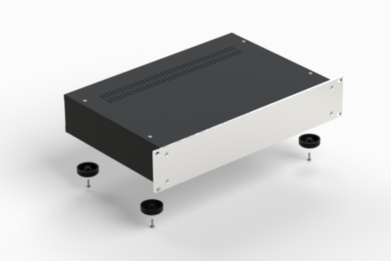 Series of modern styled enclosures with extremely accurate finish. The front panel is manufactured from silver anodised aluminium, the cover and the side panels from black steel. Ventilated covers. Panels remove easily while leaving the sub-assembly intact. ACCESSORIES: internal base mm. 175 x 435 (Mod. LEVEL) - Flat anodised aluminium handles, silver or black colour (FLAT RACK) - Round handles in black plastified steel (ROUND RACK).